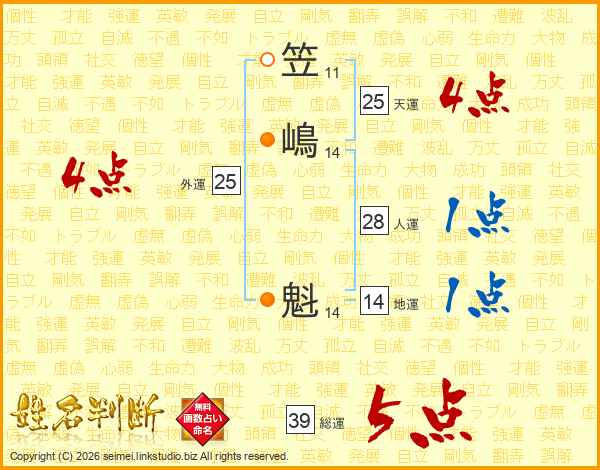 生活面を象徴する運勢です。外部から受ける影響力を表し、結婚運、家庭運や職場、環境への順応性を表します。総運から人運を引いた画数。姓や名が1文字の場合を除く。