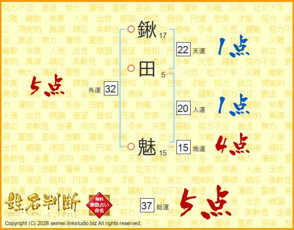 鍬田魅さんの総運は37画の5点