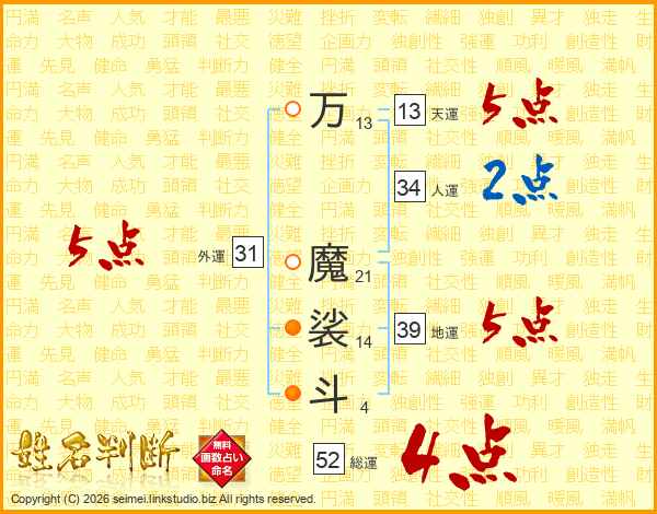 万魔裟斗さんの総運は52画の4点!