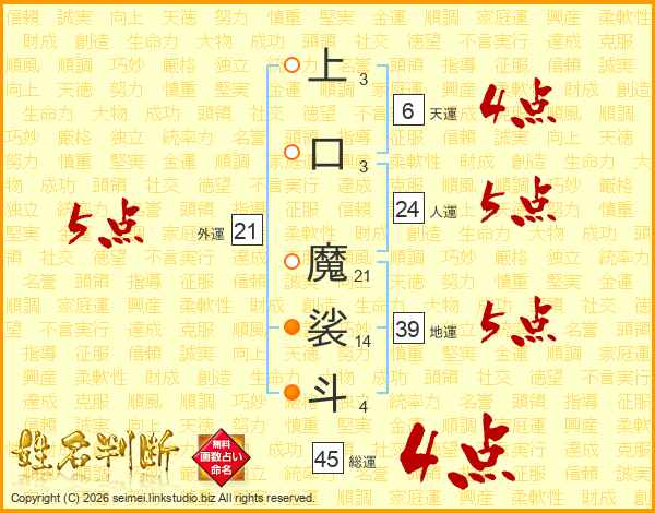 生活面を象徴する運勢です。外部から受ける影響力を表し、結婚運、家庭運や職場、環境への順応性を表します。総運から人運を引いた画数。姓や名が1文字の場合を除く。