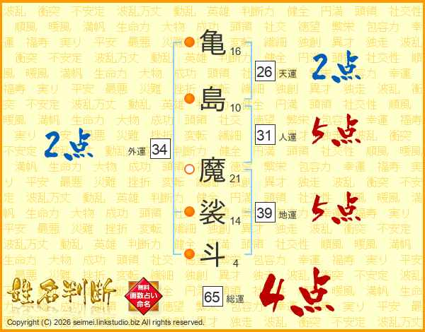 亀(16画)島(10画) 魔(21画)裟(14画)斗(4画)