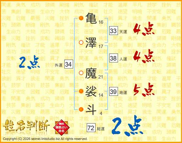亀(16画)澤(17画) 魔(21画)裟(14画)斗(4画)