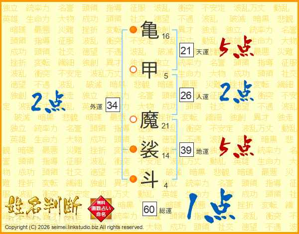 亀甲魔裟斗さんの総運は60画の1点!