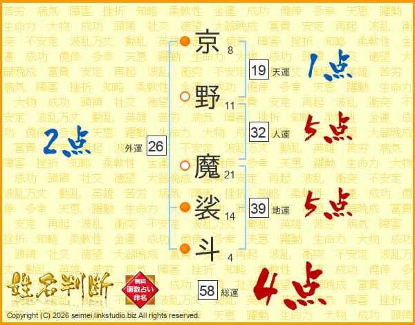 京(8画)野(11画) 魔(21画)裟(14画)斗(4画)