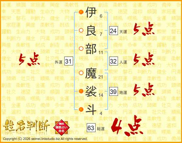 伊良部魔裟斗さんの総運は63画の4点!