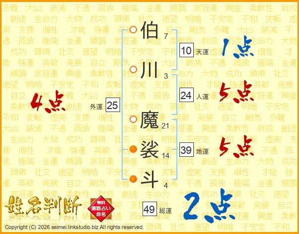 伯川魔裟斗さんの総運は49画の2点!