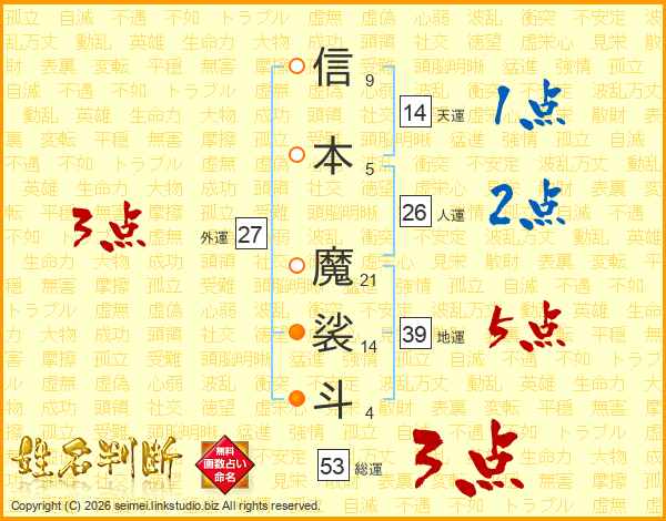 信(9画)本(5画) 魔(21画)裟(14画)斗(4画)