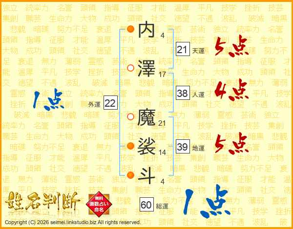 内澤魔裟斗さんの天運は21画の5点!