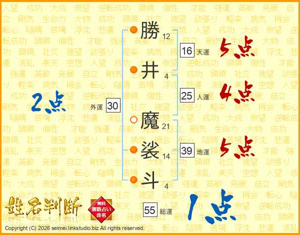 勝井魔裟斗さんの天運は16画の5点!