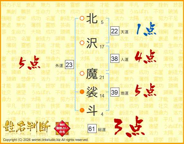 北(5画)沢(17画) 魔(21画)裟(14画)斗(4画)