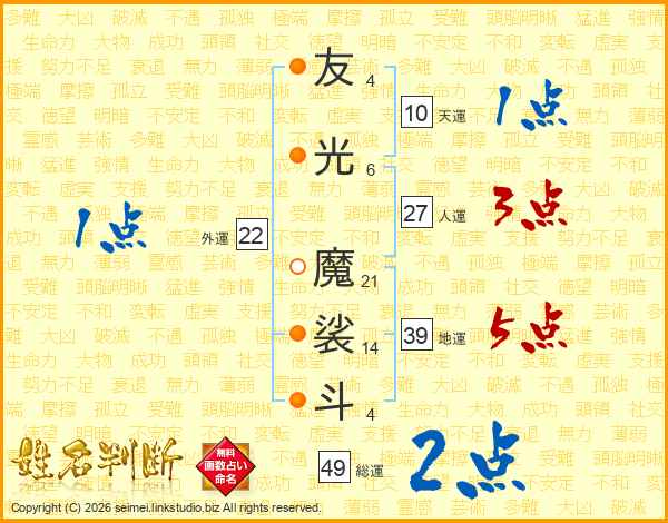 友(4画)光(6画) 魔(21画)裟(14画)斗(4画)