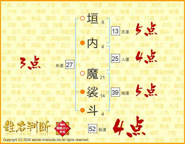 垣内魔裟斗さんの総運は52画の4点!