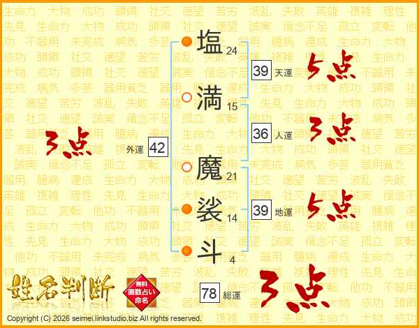 塩満魔裟斗さんの天運は39画の5点!