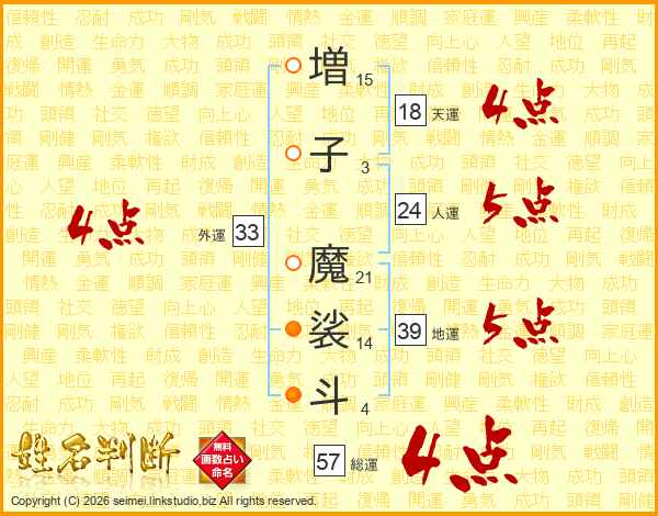増(15画)子(3画) 魔(21画)裟(14画)斗(4画)