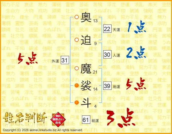 奥迫魔裟斗さんの総運は61画の3点!