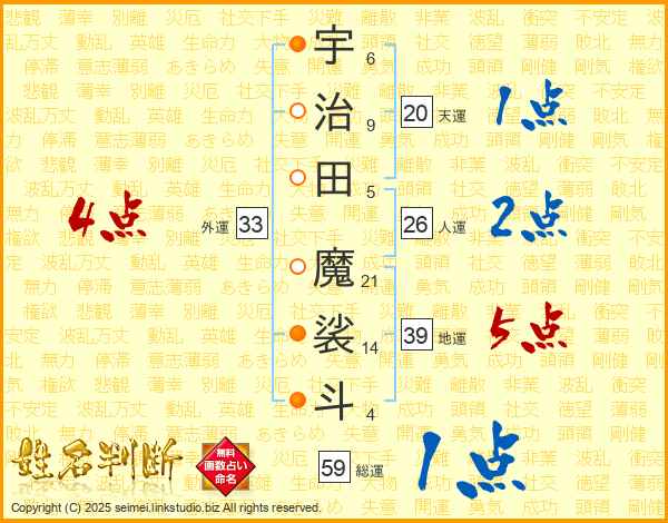 宇(6画)治(9画)田(5画) 魔(21画)裟(14画)斗(4画)