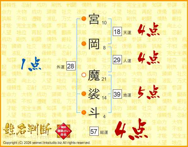 宮(10画)岡(8画) 魔(21画)裟(14画)斗(4画)