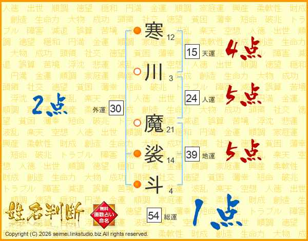 寒川魔裟斗さんの総運は54画の1点!