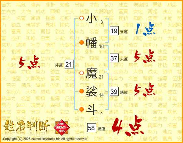小幡魔裟斗さんの総運は58画の4点!