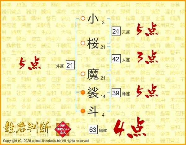 小桜魔裟斗さんの総運は63画の4点!