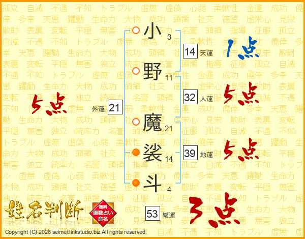 小野魔裟斗さんの外運は21画の5点!