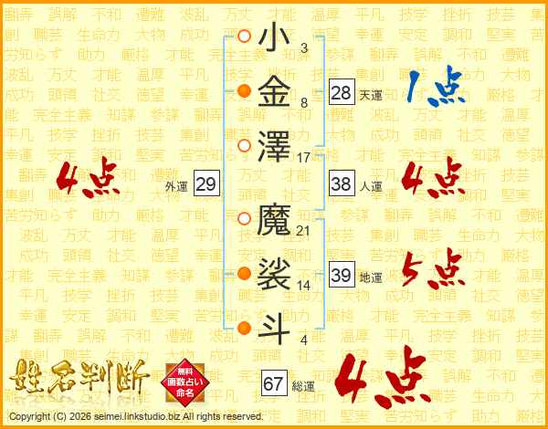 小(3画)金(8画)澤(17画) 魔(21画)裟(14画)斗(4画)