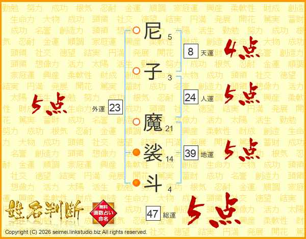 尼(5画)子(3画) 魔(21画)裟(14画)斗(4画)