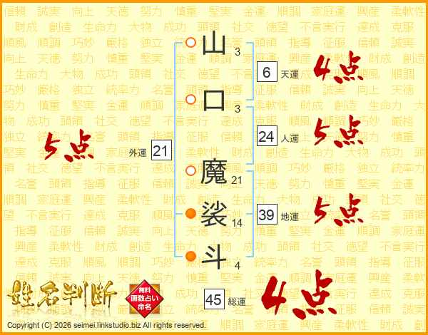 山(3画)口(3画) 魔(21画)裟(14画)斗(4画)