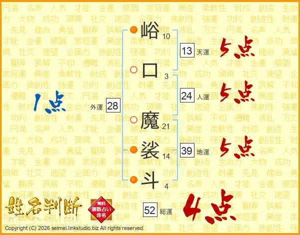 峪口魔裟斗さんの総運は52画の4点!