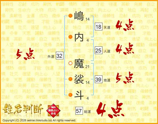 嶋内魔裟斗さんの外運は32画の5点!