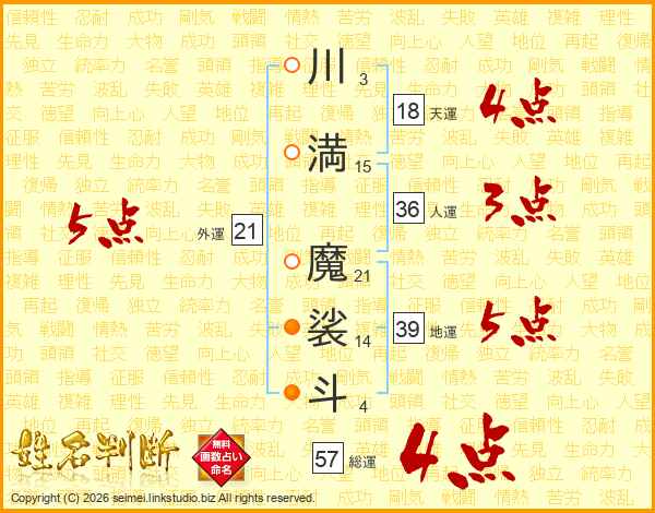 川(3画)満(15画) 魔(21画)裟(14画)斗(4画)