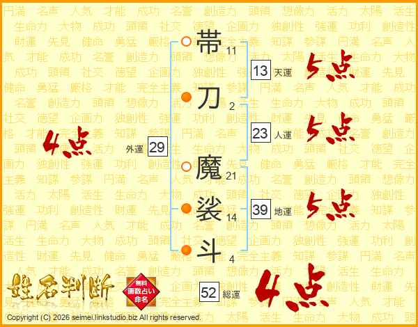 帯(11画)刀(2画) 魔(21画)裟(14画)斗(4画)
