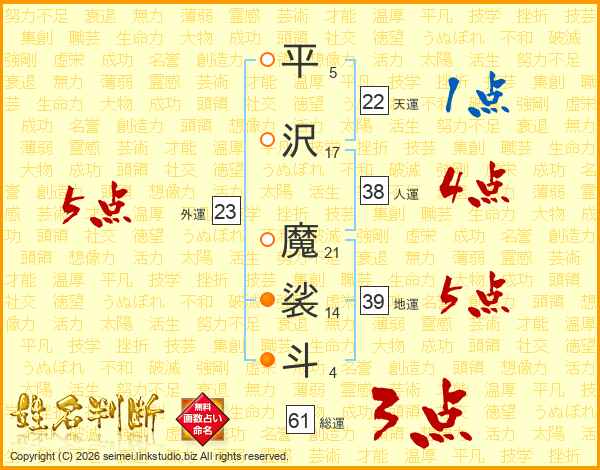 平(5画)沢(17画) 魔(21画)裟(14画)斗(4画)