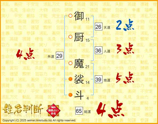 御(11画)厨(15画) 魔(21画)裟(14画)斗(4画)