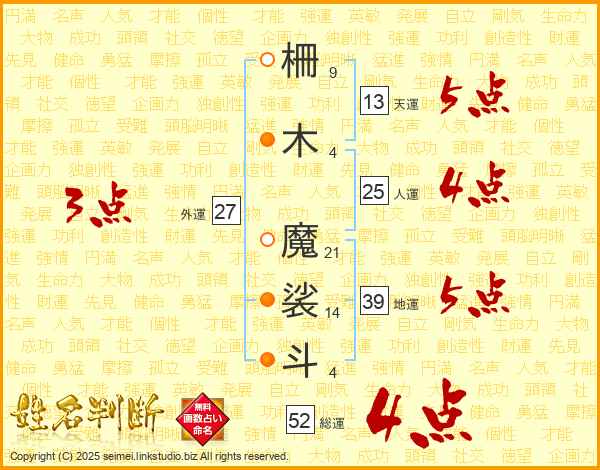 柵(9画)木(4画) 魔(21画)裟(14画)斗(4画)