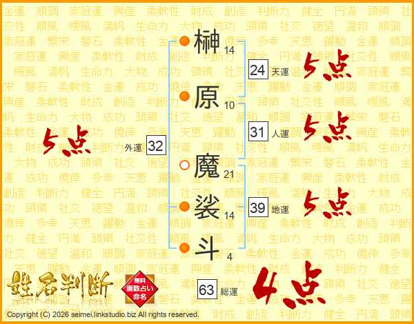 榊原魔裟斗さんの総運は63画の4点!