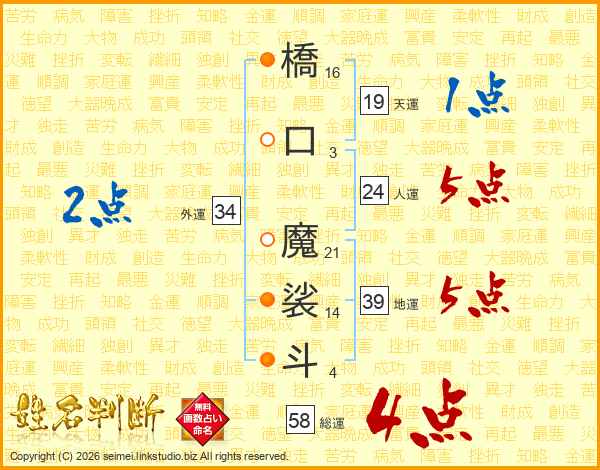 橋口魔裟斗さんの総運は58画の4点!
