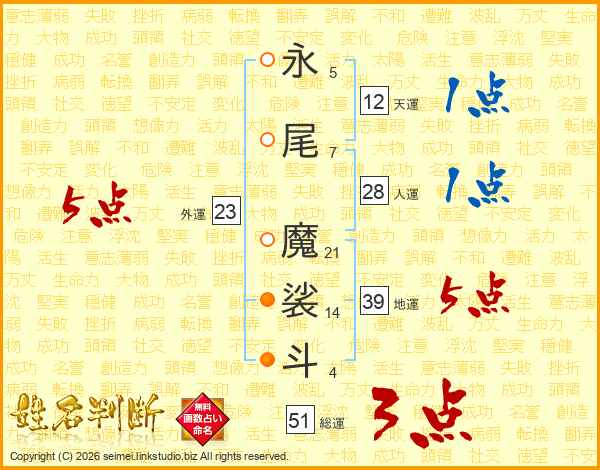 永尾魔裟斗さんの総運は51画の3点!
