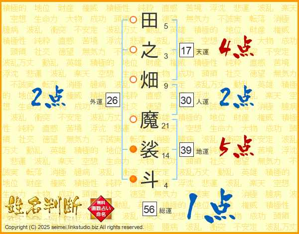 田(5画)之(3画)畑(9画) 魔(21画)裟(14画)斗(4画)