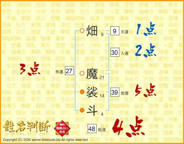 畑魔裟斗さんの地運は39画の5点!