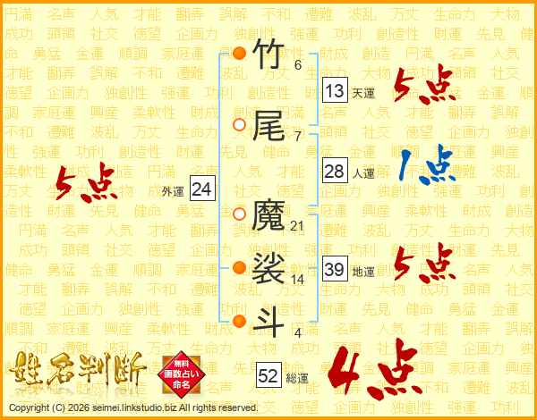 竹尾魔裟斗さんの総運は52画の4点!