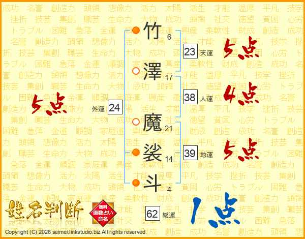 竹澤魔裟斗さんの地運は39画の5点!