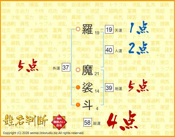 羅(19画) 魔(21画)裟(14画)斗(4画)