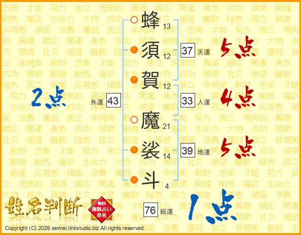蜂須賀魔裟斗さんの総運は76画の1点!