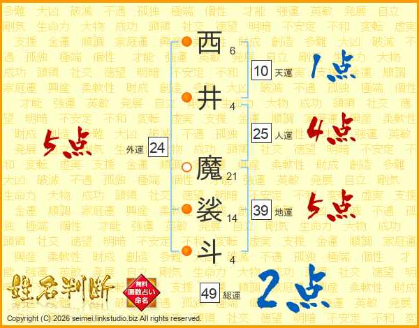 あなたの人生を表す1番重要な運勢です。生涯を通じて影響する総合運となり、主に50歳以降の晩年期に影響を及ぼします。苗字と名前の合計画数。
