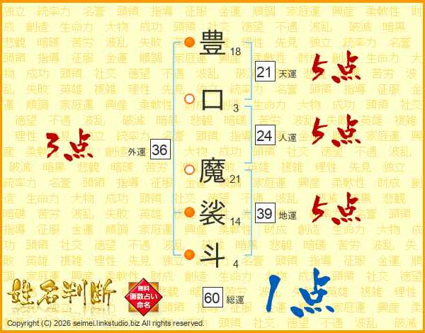 豊(18画)口(3画) 魔(21画)裟(14画)斗(4画)