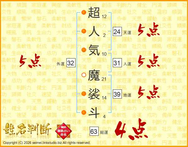 超(12画)人(2画)気(10画) 魔(21画)裟(14画)斗(4画)