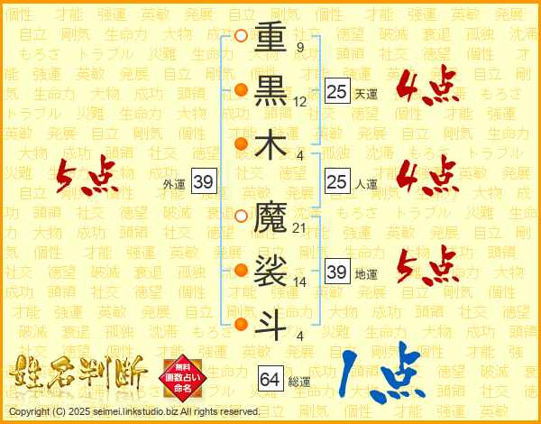 重(9画)黒(12画)木(4画) 魔(21画)裟(14画)斗(4画)