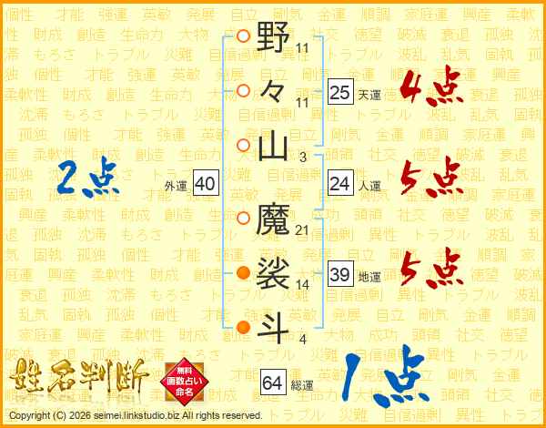 野(11画)々(11画)山(3画) 魔(21画)裟(14画)斗(4画)