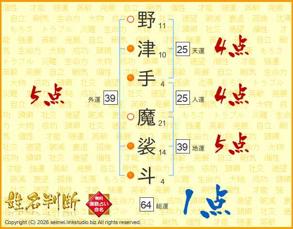 野(11画)津(10画)手(4画) 魔(21画)裟(14画)斗(4画)